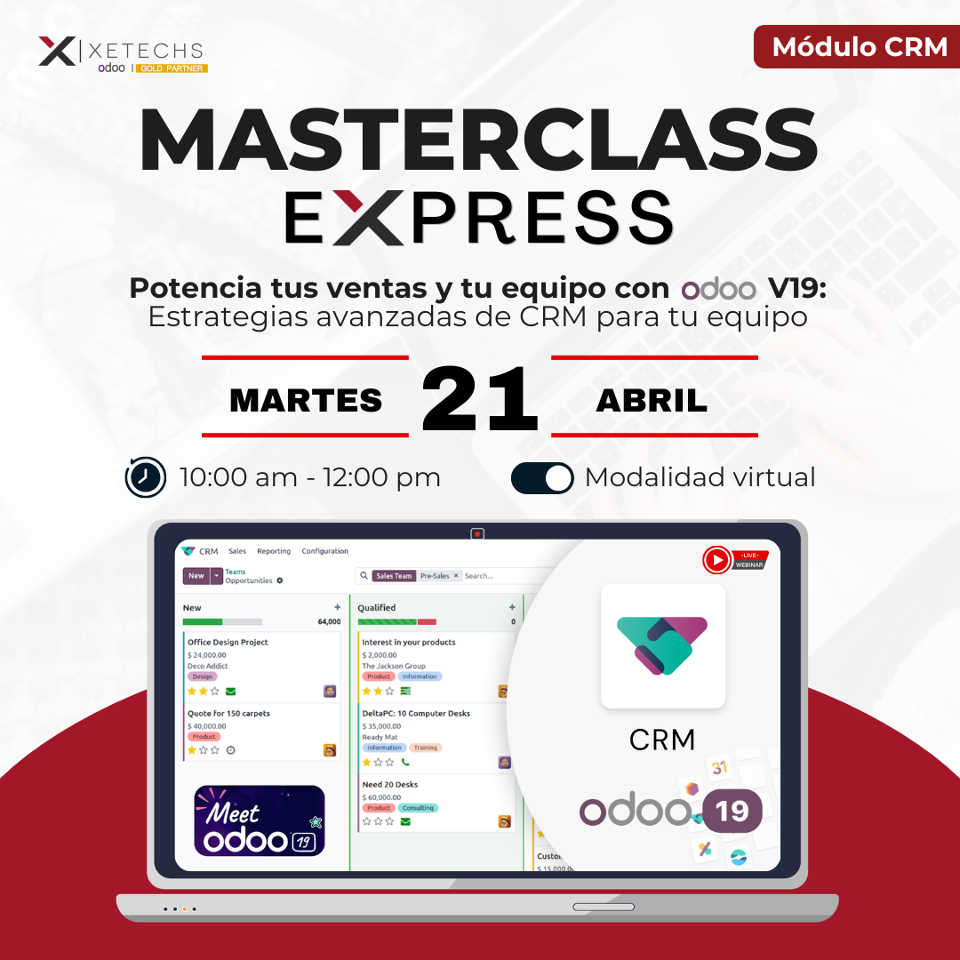 ¡No te quedes fuera! En esta Masterclass exploraremos a fondo las innovadoras mejoras que ofrece Odoo V19 en su módulo CRM. Te mostraremos, en vivo y de forma práctica, cómo estas nuevas herramientas están diseñadas para optimizar tu ciclo de ventas, facilitar el seguimiento de clientes y darle a tu equipo el impulso definitivo para cerrar más negocios. ¡Acompáñanos y transforma tu gestión comercial!